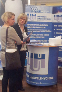 Das Labor für Umwelthygiene (LUH) konnte an seinem Stand zu dem Thema der Infektionsprävention in der Zahnheilkunde weiter informieren und Tipps für die praktische Umsetzung geben. Nach den Anforderungen der novellierten Trinkwasserverordnung muss das Wasser in den Dentaleinheiten frei von Krankheitserregern sein. Immer öfter  ist eine Kontamination dieser wasserführenden Systeme zu beobachten. Ursachen können Hausinstallationen, periodisch genutzten Dentaleinheiten oder der Stillstand der Dentaleinheiten über längere Zeiträume sowie mangelhafte Desinfektionen sein. Die Folge sind  Biofilme, die optimale Lebensbedingungen für Mikroorganismen (Krankheitskeime) bieten. Bei der Behandlung der Patienten gelangen diese über Aerosole in die Wunden in den  Mundraum und können so u.a Lungenerkrankungen hervorrufen.